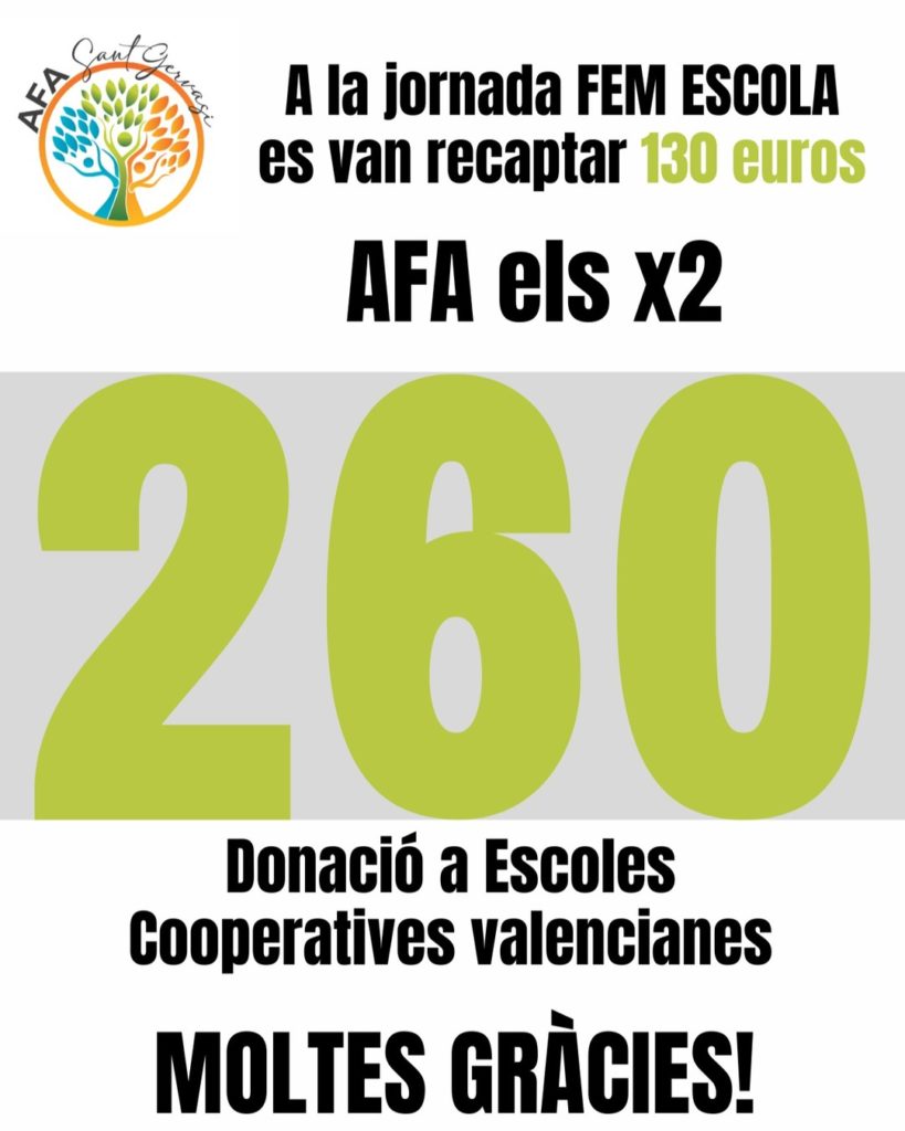 L’Associació de Famílies d’Alumnes (AFA) de l’Escola Sant Gervasi ha estat present a la jornada Fem Escola amb una carpa informativa, on totes les famílies han pogut conèixer les activitats que es duen a terme i participar-hi activament. Aquesta iniciativa permet reforçar la vinculació entre les famílies i l’escola, promovent un espai de col·laboració i informació mútua.
